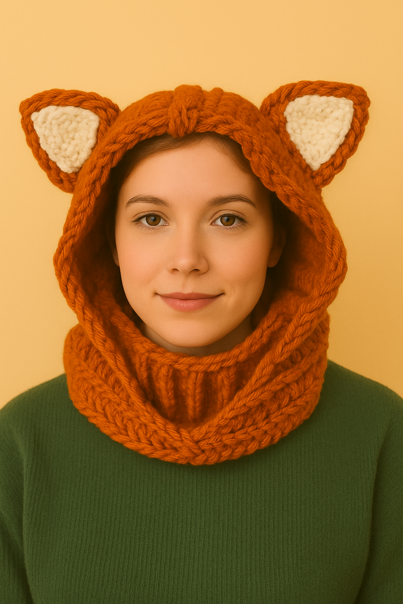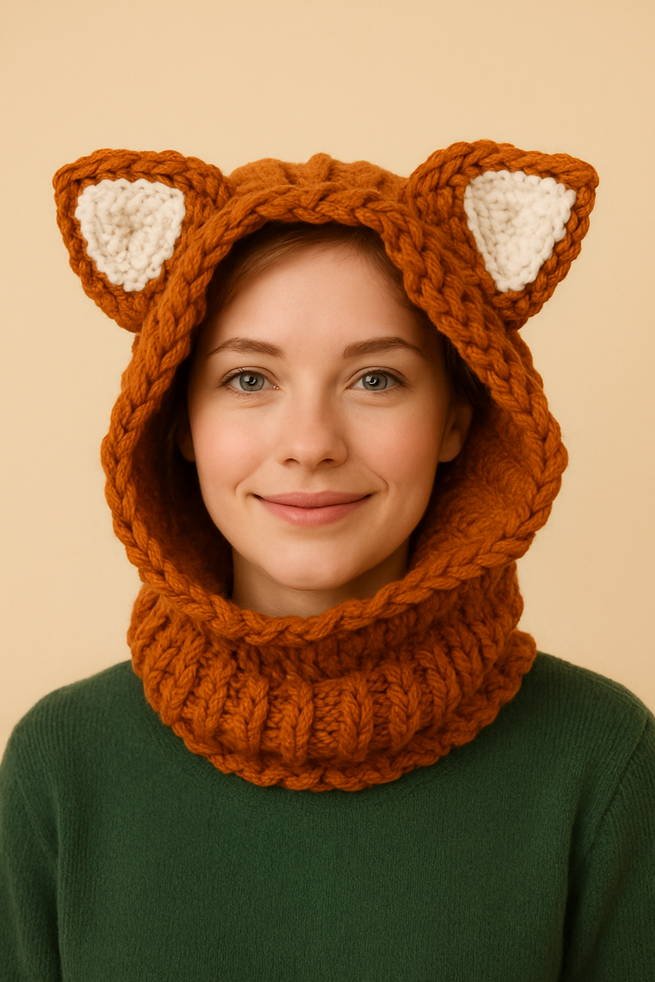Odkryj wyjątkową czapkę z uszami, która zachwyca niepowtarzalnym wzorem rudego lisa! Wykonana ręcznie z miękkiej włóczki w pięknym pomarańczowo-rudym kolorze, łączy oryginalny design z funkcjonalnością. Zawadiackie uszy, starannie doszyte na górze kaptura, nadają jej charakteru i uroku.